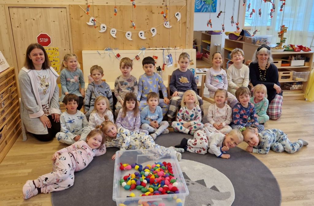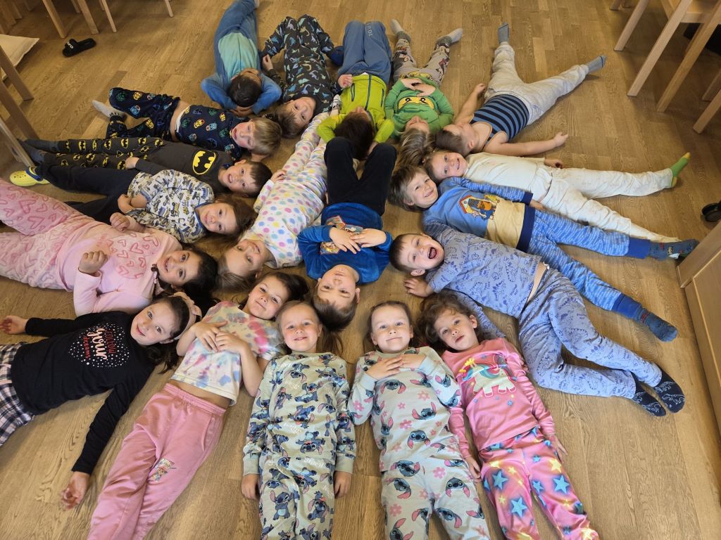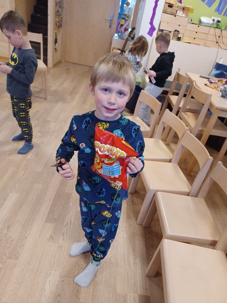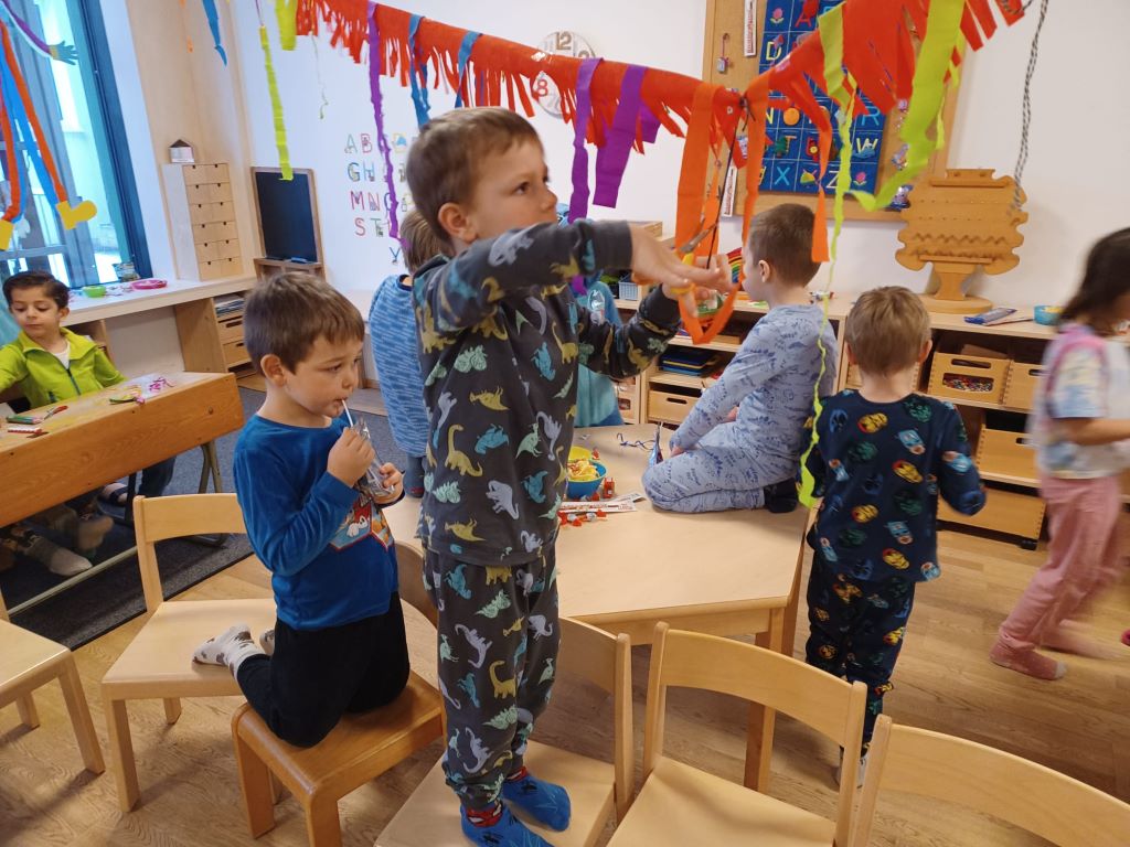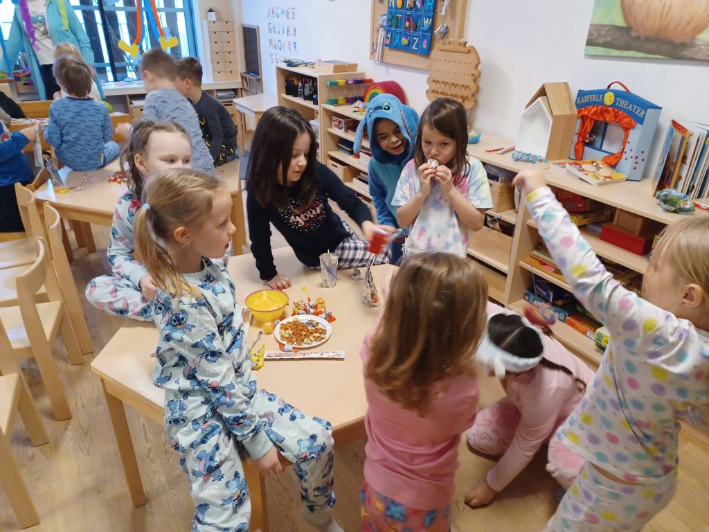An diesem Tag dürfen alle im Pyjama in den Kindergarten kommen und sich den ganzen Vormittag lang von jenen Süßigkeiten, welche die Eltern mitgebracht haben, ernähren. Sie brauchen sich auch nicht zum Tisch setzen, sondern sich so “platzieren”, wie es für sie am gemütlichsten ist.