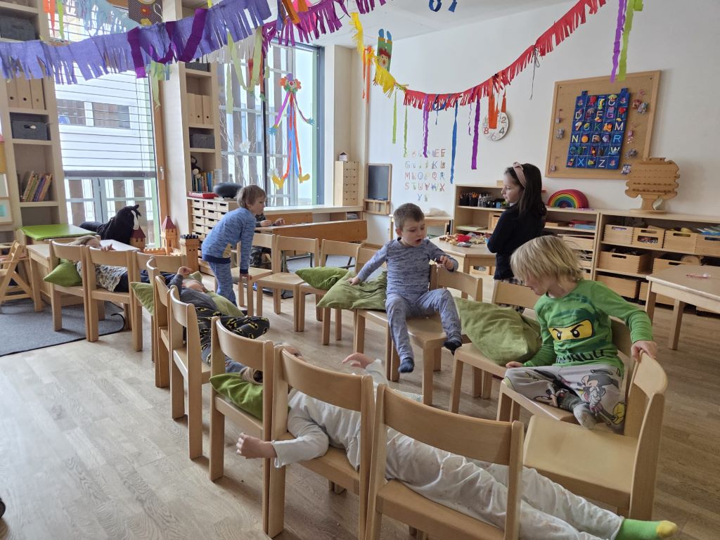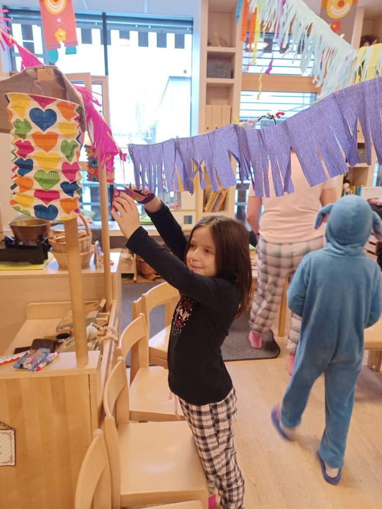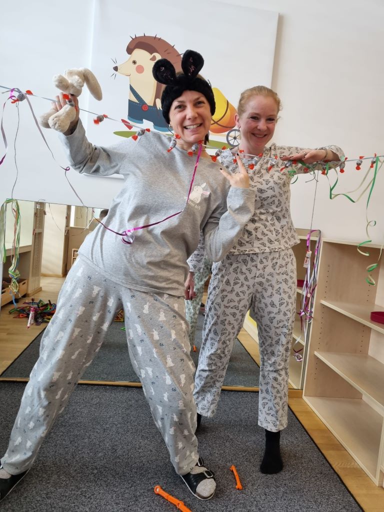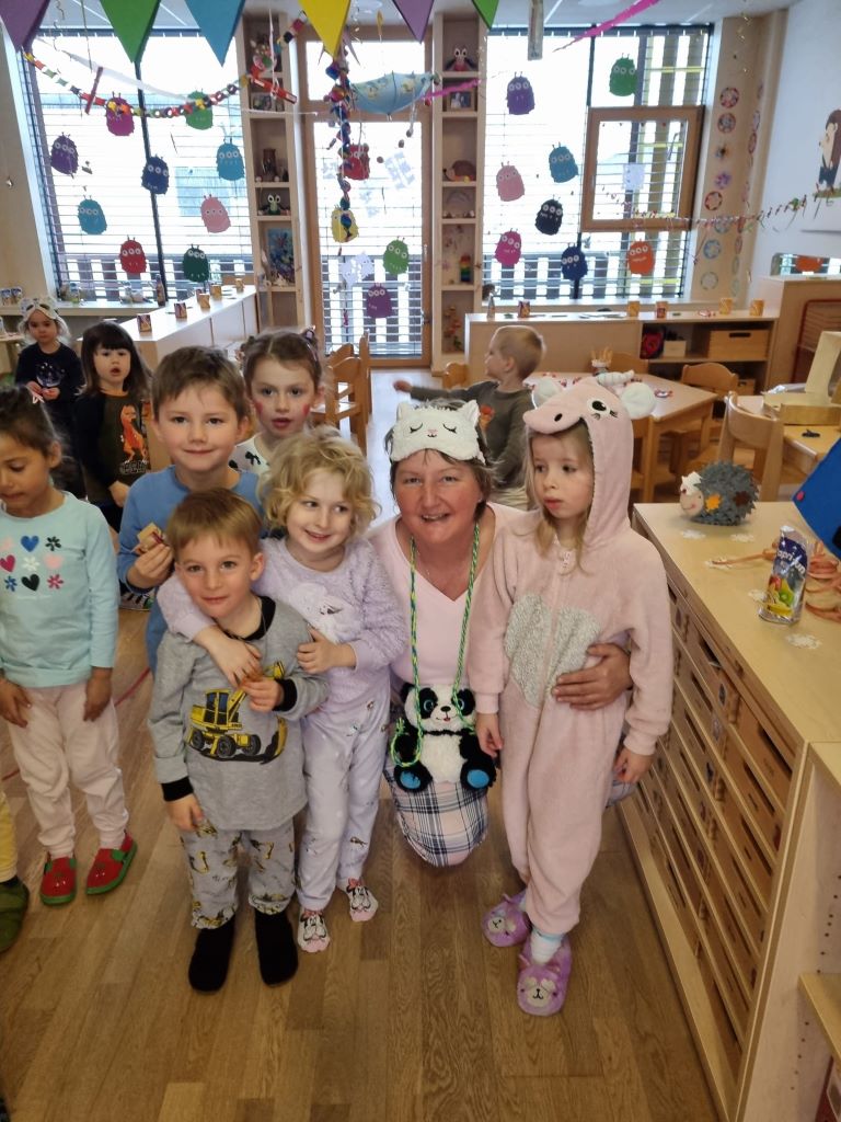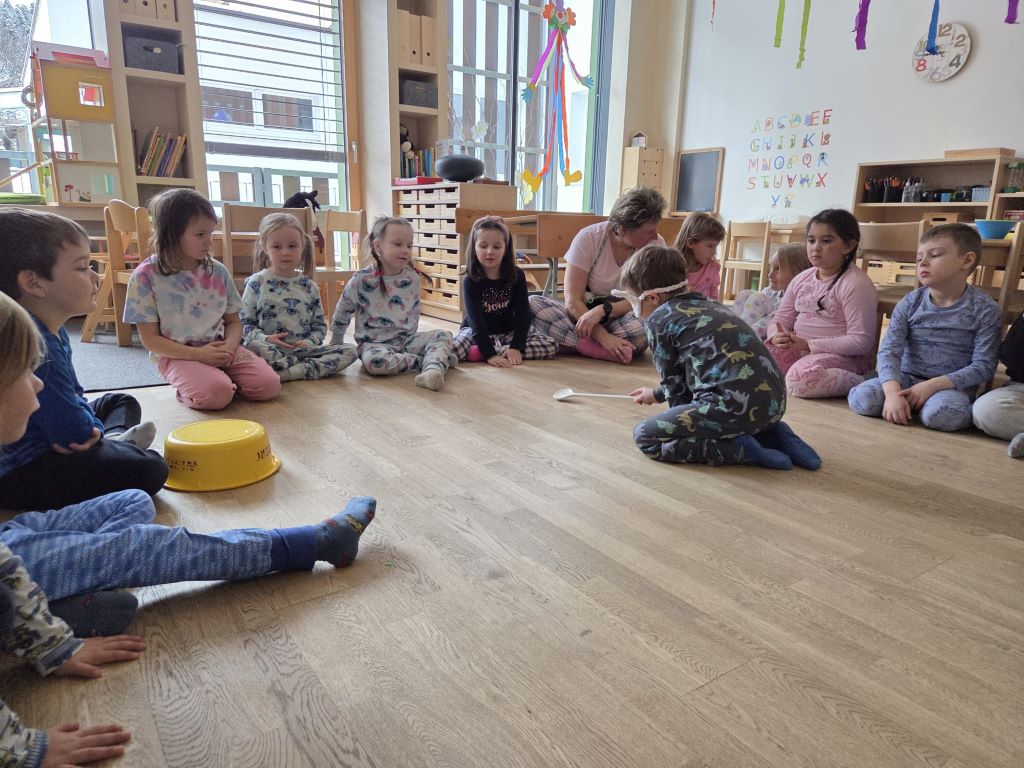 An diesem Tag dürfen alle im Pyjama in den Kindergarten kommen und sich den ganzen Vormittag lang von jenen Süßigkeiten, welche die Eltern mitgebracht haben, ernähren. Sie brauchen sich auch nicht zum Tisch setzen, sondern sich so “platzieren”, wie es für sie am gemütlichsten ist.
