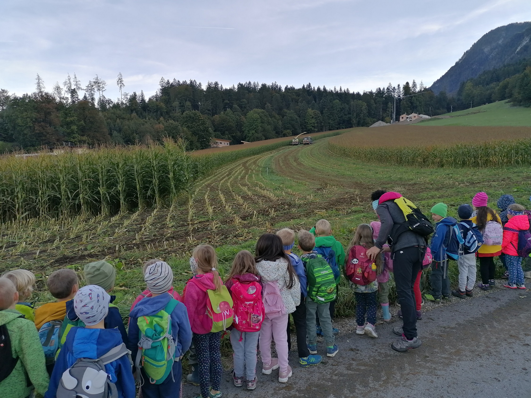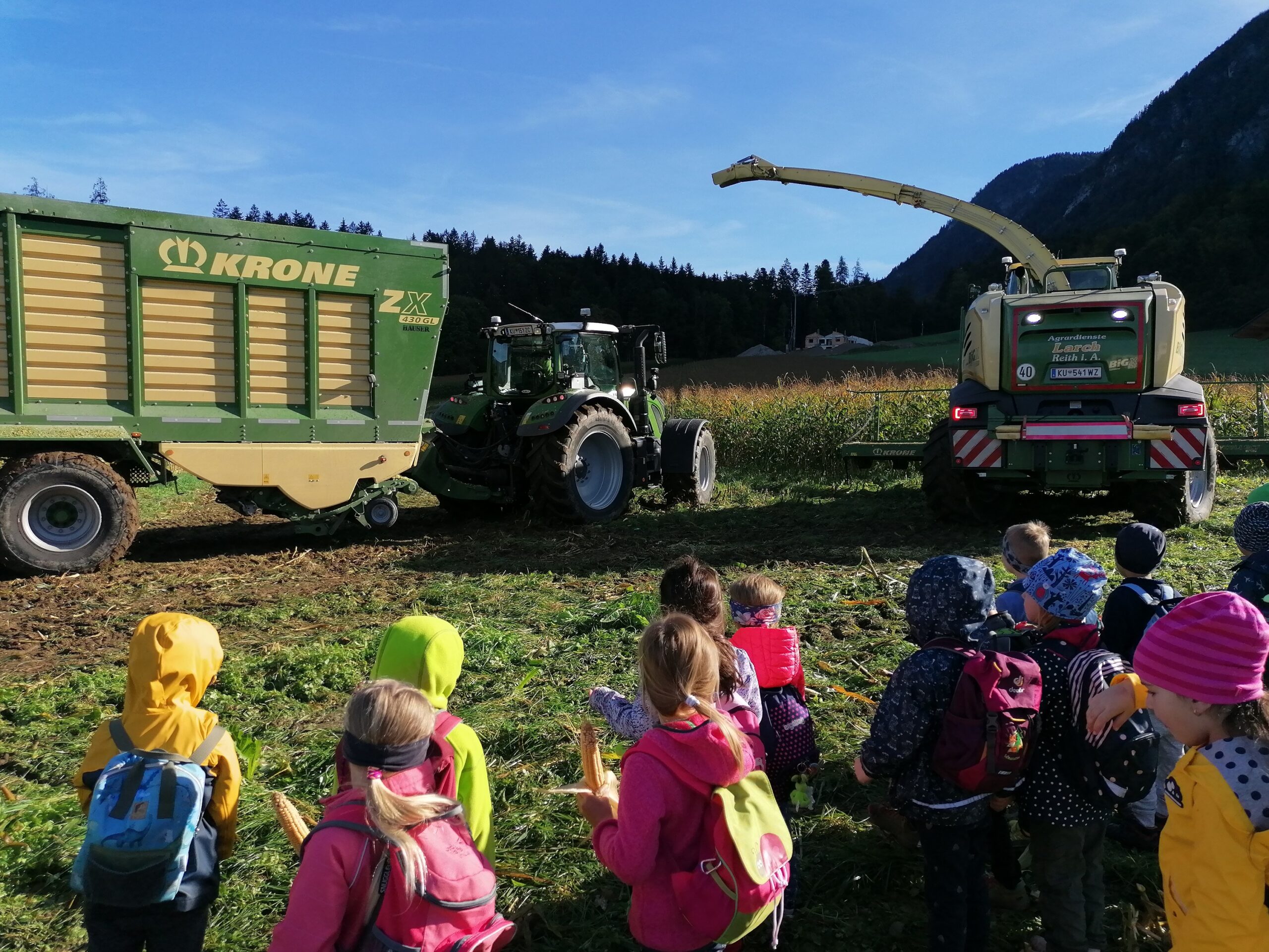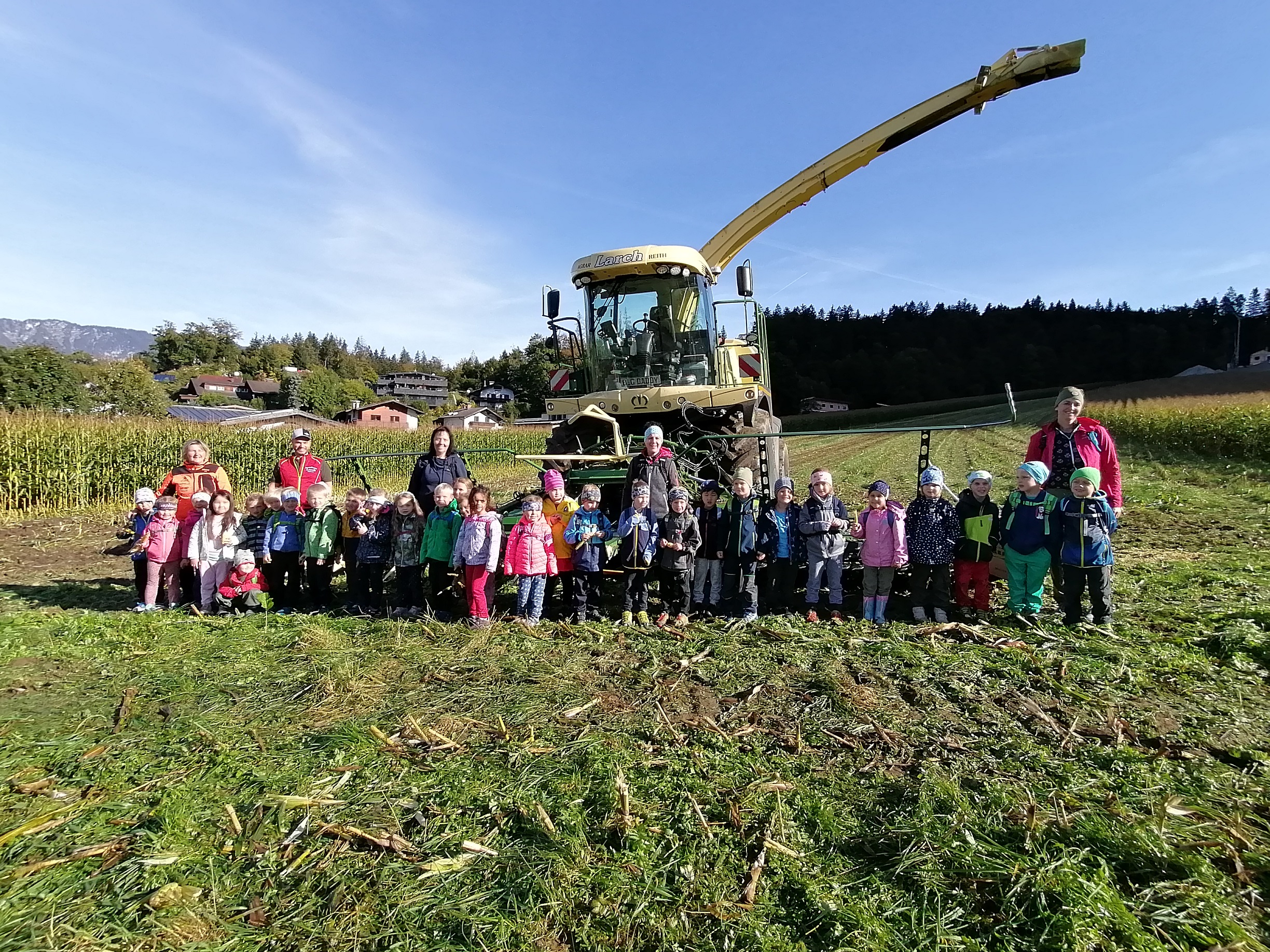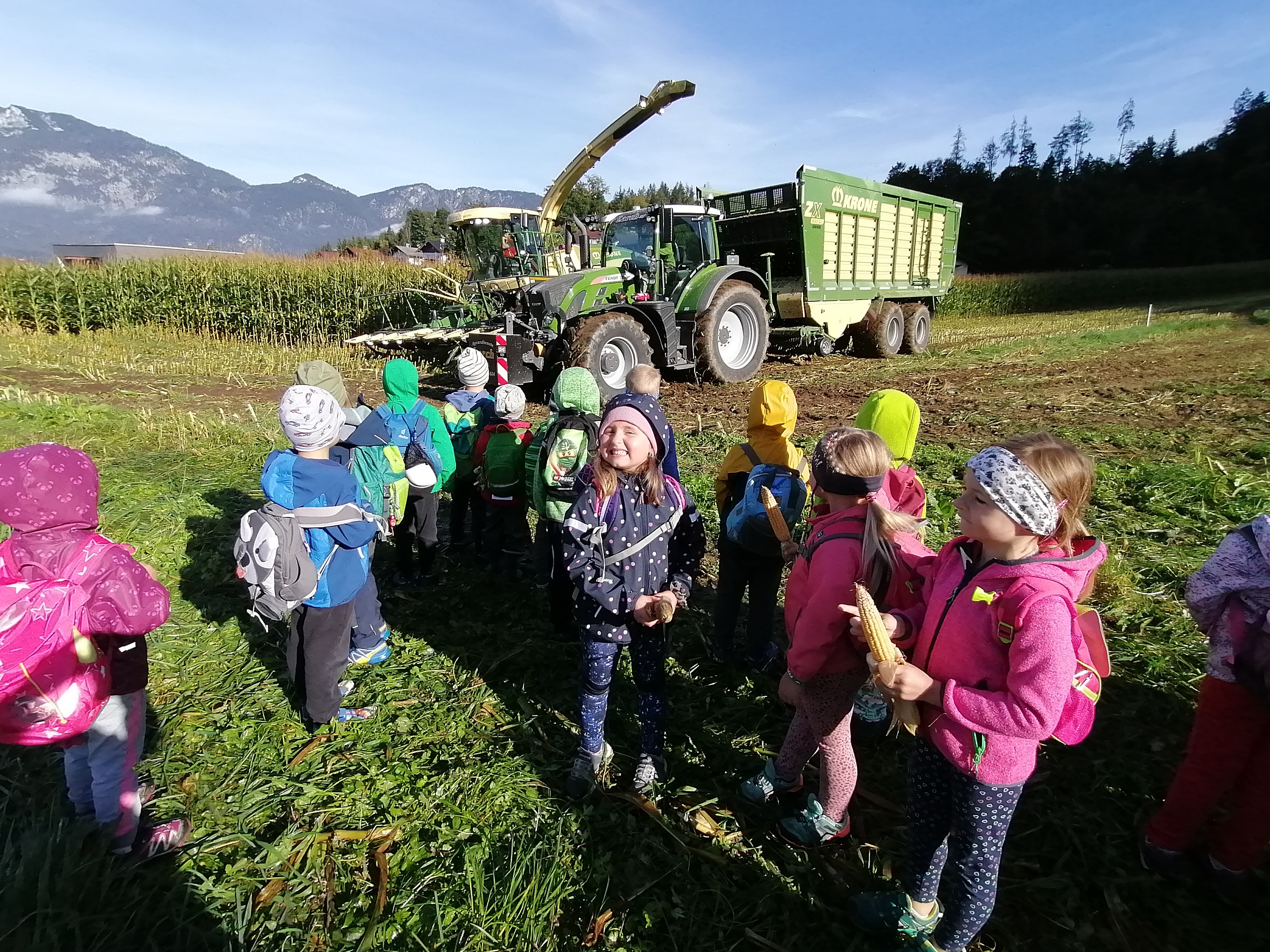 Nachdem wir einiges über dem Mais gelernt und gebastelt haben, hatten wir heuer sogar die Möglichkeit bei der Maisernte am “Lieferterfeld” dabei zu sein.