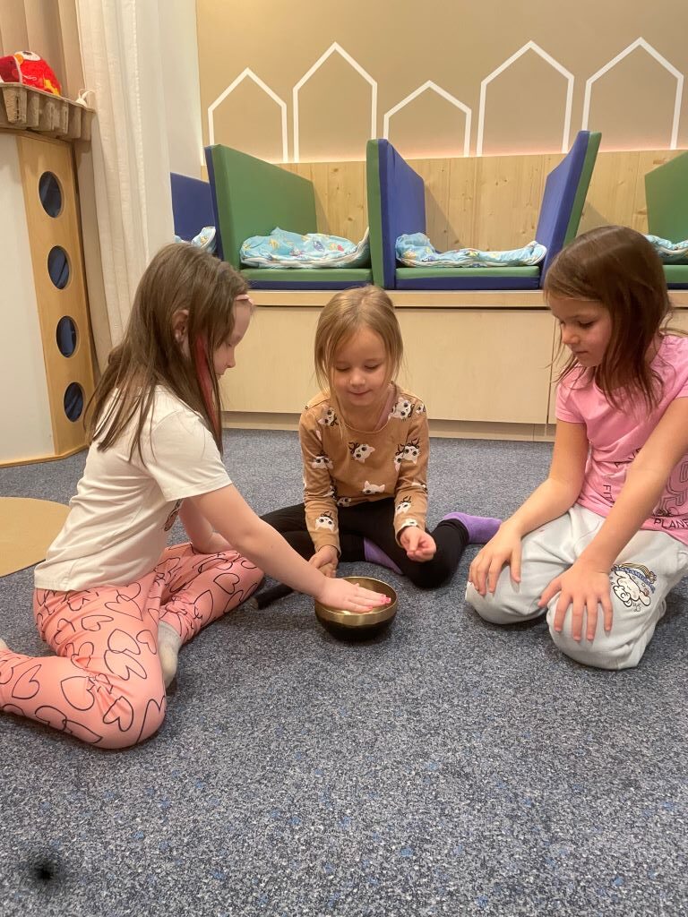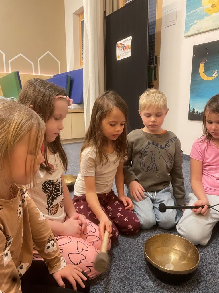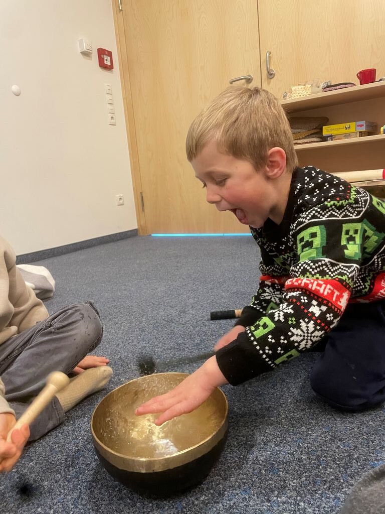 Im Sinnesraum habe ich gemeinsam mit den Kindern mehrfach mit Klangschalen gearbeitet. Ziel war es, den Kindern erfahrbar zu machen, dass Klänge nicht nur gehört, sondern auch gespürt und sogar gesehen werden können.