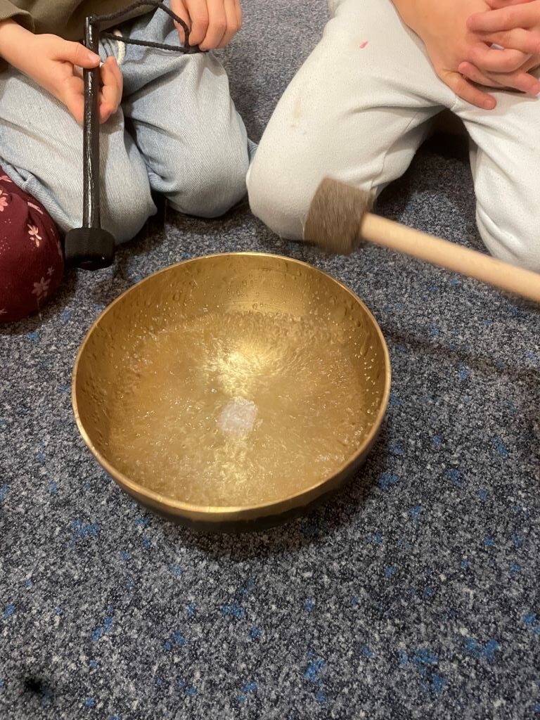 Im Sinnesraum habe ich gemeinsam mit den Kindern mehrfach mit Klangschalen gearbeitet. Ziel war es, den Kindern erfahrbar zu machen, dass Klänge nicht nur gehört, sondern auch gespürt und sogar gesehen werden können.