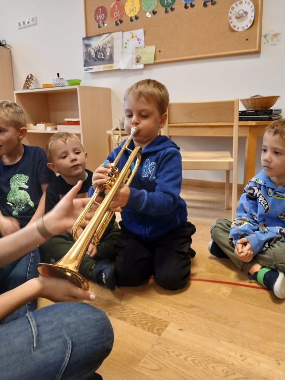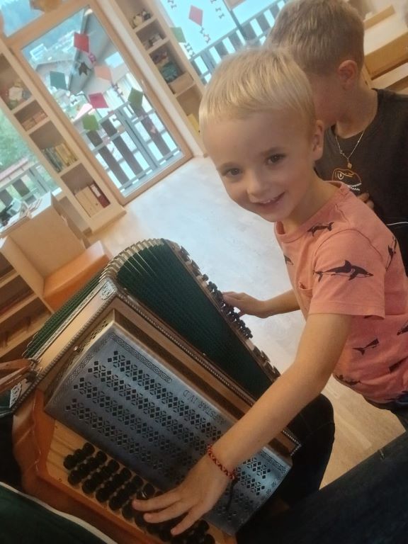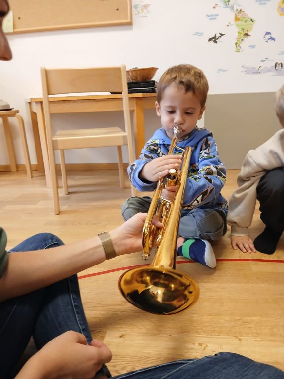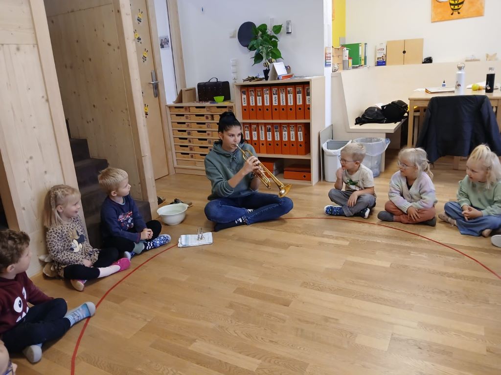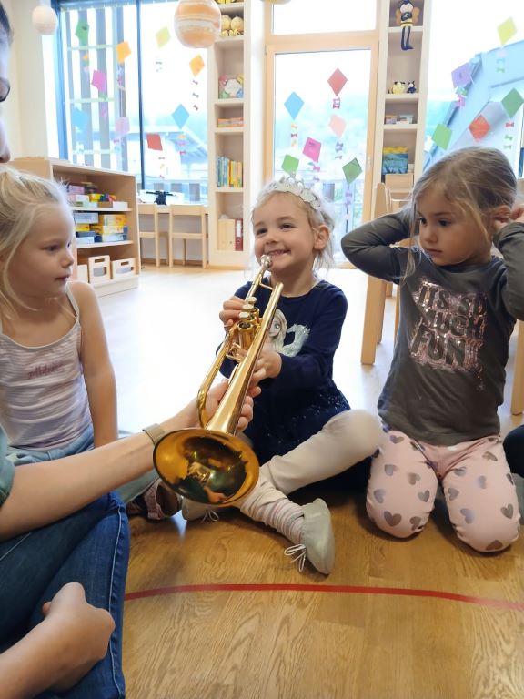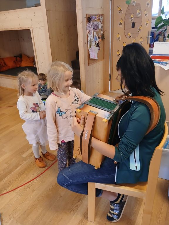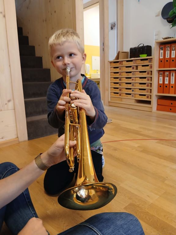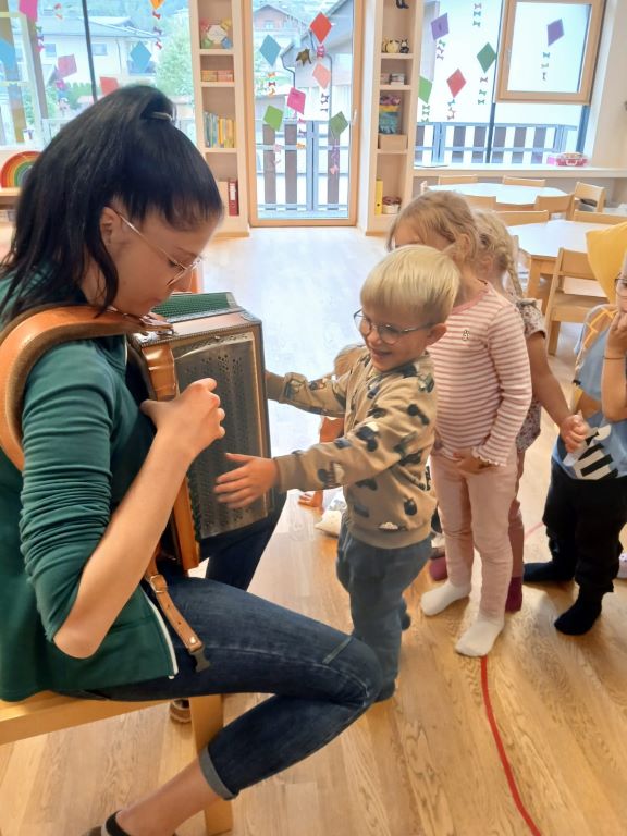 In dieser Woche konnten unsere Kinder ein ganz besonderes musikalisches Erlebnis genießen: Ich brachte ihnen eine Trompete und eine Steirische mit in den Kindergarten. Zuerst wurde gelauscht: Die Kinder waren fasziniert von den unterschiedlichen Klängen der beiden Instrumente. Die Trompete mit ihrem kräftigen, klaren Ton brachte viele Augen zum Leuchten – und sorgte für staunende Gesichter. Die Steirische hingegen verzauberte mit seinen weichen, fließenden Melodien und weckte bei manchen sogar Lust zum Mitsingen.Natürlich durften die Kinder die Instrumente auch selbst ausprobieren! Mit viel Neugier und Freude wagten sich die Kleinen ans Mundstück der Trompete oder durften bei der Steirischen die Tasten drücken und den Balg bewegen. Für viele war es das erste Mal, ein echtes Blas- oder Tasteninstrument in der Hand zu halten – eine aufregende Erfahrung!