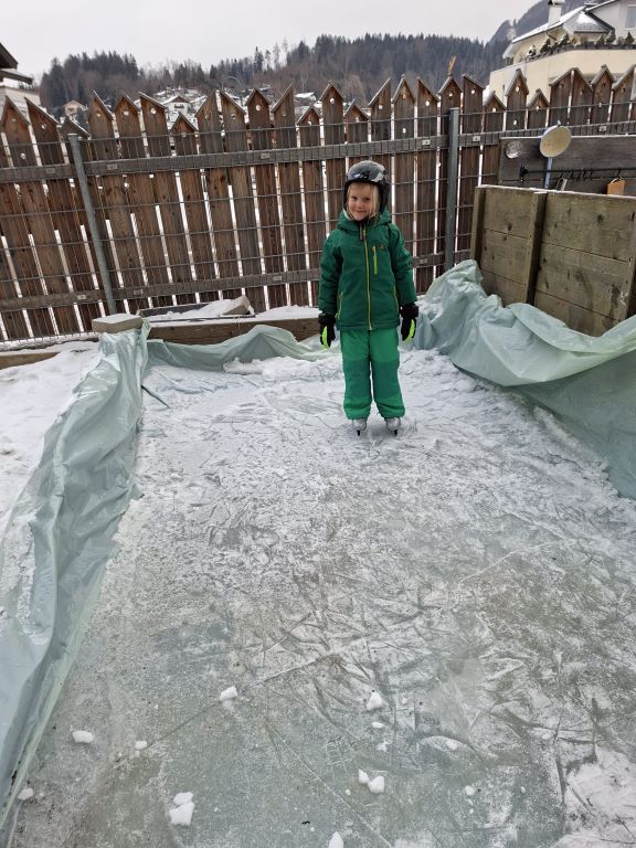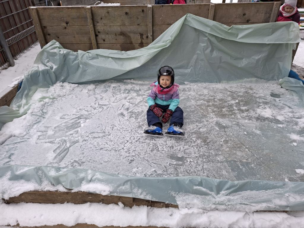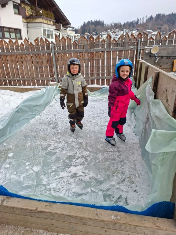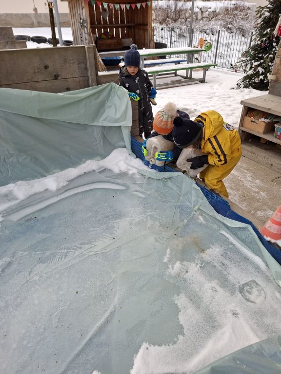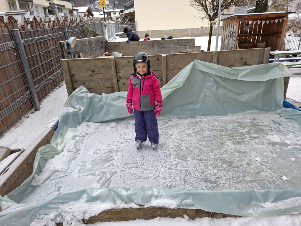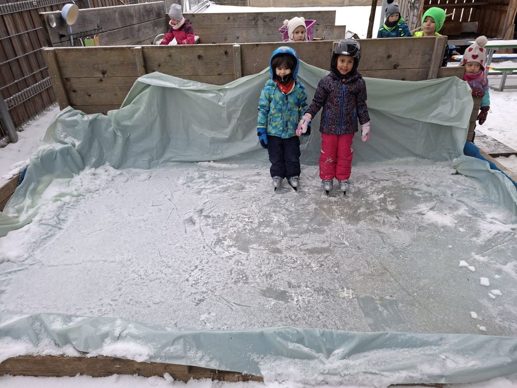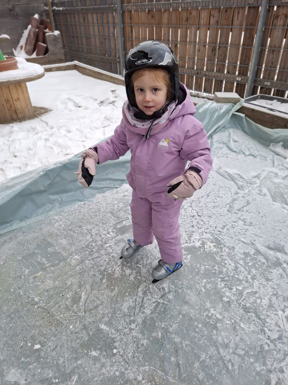 Im kleinen Garten wurde in diesem Winter ein besonderer Eislaufplatz für die Kinder gebaut. Die Idee dazu hatte Verena gemeinsam mit den Kindern. Ziel war es, den Winter aktiv zu nutzen, und den Kindern ein besonderes Erlebnis zu ermöglichen.