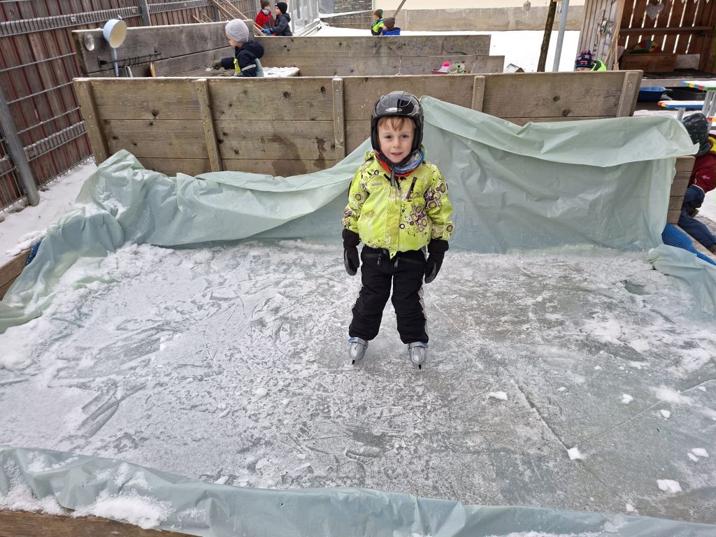 Die Kinder hatten viel Freude am Eislaufen und konnten dabei ihre Balance und Bewegung trainieren. Der selbst gebaute Eislaufplatz war ein tolles Projekt und sorgte für viel Begeisterung im Kindergarten.