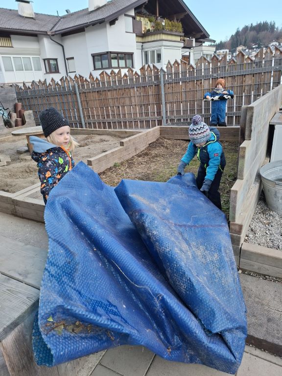Zuerst wurde eine große Plane über die Sandkiste im Garten gelegt, dadurch konnte das Wasser später nicht im Sand versickern. Anschließend füllten die Kinder die Sandkiste mit Wasser. Dafür wurden insgesamt 60 Liter Wasser mit Kübeln in die Sandkiste gegossen.