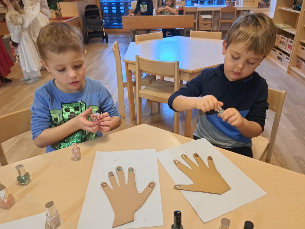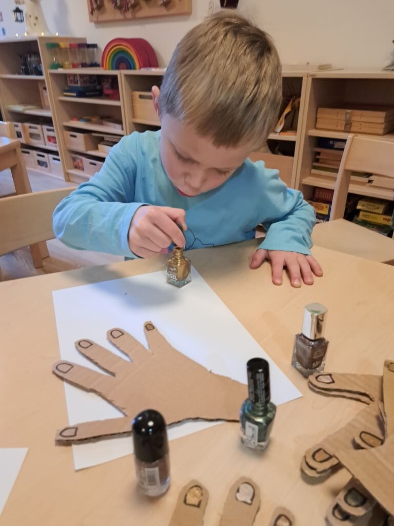 Bevor sich die Kinder selber die Nägel lackieren durften, oder sich im Gesicht schminken konnten, versuchten sie es zuerst auf vorbereiteten Kartonhänden oder bereit gestellten “Schminkköpfen”. Während einige dieses Tätigkeit kaum interessierte, nahmen andere Kinder dieses Angebot mit Freude und Begeisterung an.